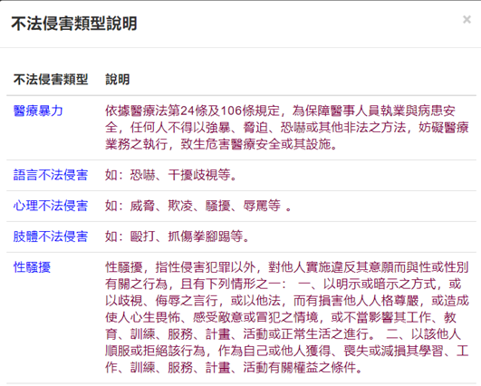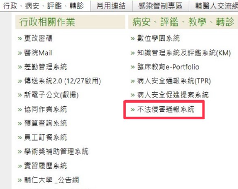 不法侵害系統介紹 / 系統說明 / 作者: 陳羿愷 第一入口:EIP系統 EIP -> 行政、病安、評鑑、轉診 -> 不法侵害通報系統 第二入口:協同作業系統 由協同進入:協同作業系統 -> 行政事務類 -> 不法侵害通報系統 本系統結合以下特色: 整合不法侵害、醫療暴力與性騷跟騷,單一窗口線上通報。 無紙化 保密 即時 系統紀錄(所有人、事、時、地、物),可即時查看更新及上傳。 系統可通報之定義類型: 系統設有自主查核表功能,以利快速定義類型,快速分案至對應窗口,且設有追蹤機制:
